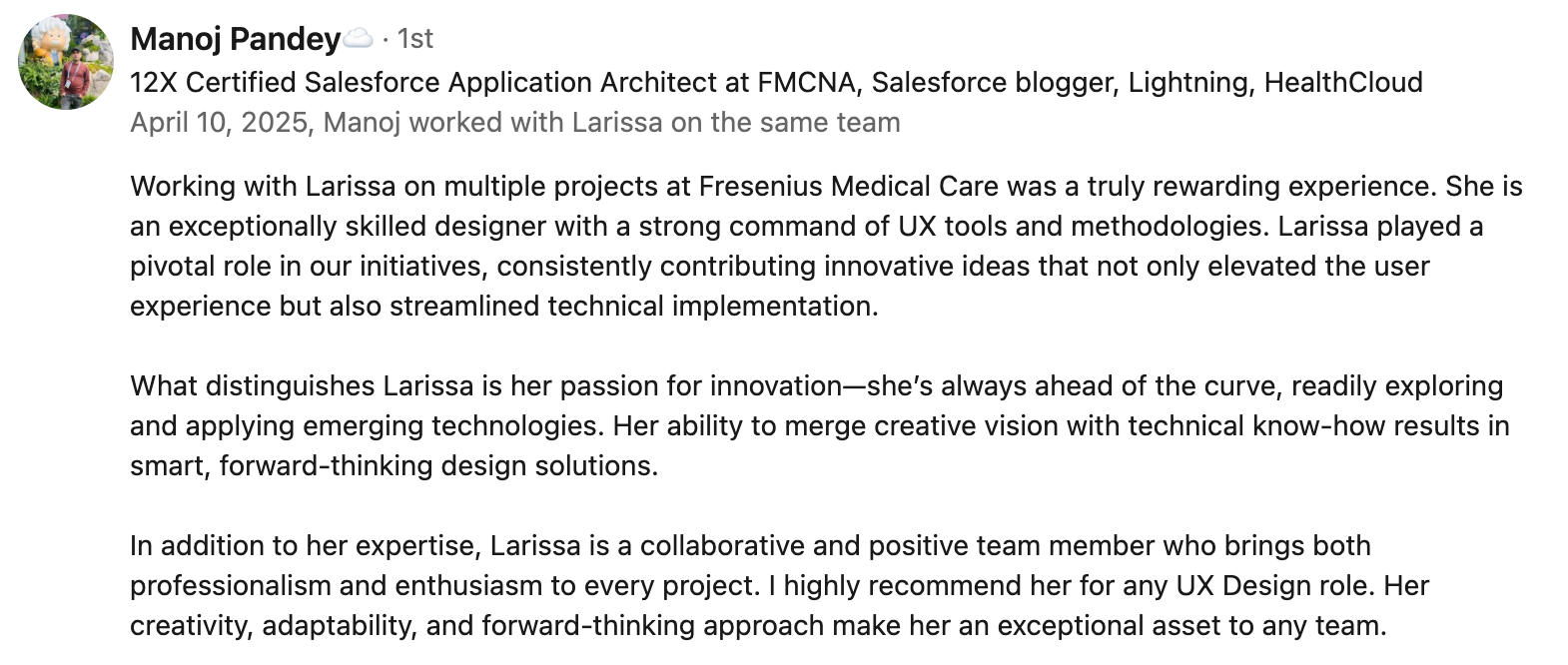 I bring over 15 years of experience designing digital products that empower people and make complex systems usable. My specialty is healthcare UX and enterprise applications, where I blend systems thinking with AI-enhanced design to streamline clinical workflows and create tools that truly support patients and care teams.